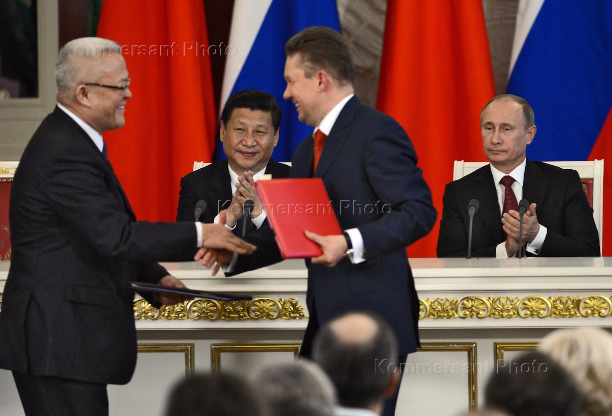 Председатель правления ОАО "Газпром" Алексей Миллер (справа) на официальной встрече президента России Владимира Путина и председателя КНР Си Цзиньпина. Встреча прошла в Георгиевском зале Большого Кремлевского дворца.