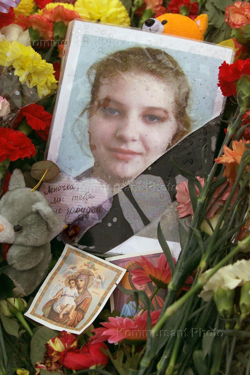 В Москве 23 октября произошел захват террористами зрительного зала ДК завода "Московский подшипник", в котором шла демонстрация мюзикла "Норд-Ост". Ответственность за захват более 700 заложников взял на себя известный чеченский боевик Мовсар Бараев. После проведения успешной спецоперации штаба по спасению заложников 42 террориста было уничтожено, 751 заложник освобожден, более 90 заложников погибло в ходе операции. Цветы, детские игрушки, икона и фотография девушки, одной из погибших заложницы у здания театрального центра.