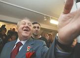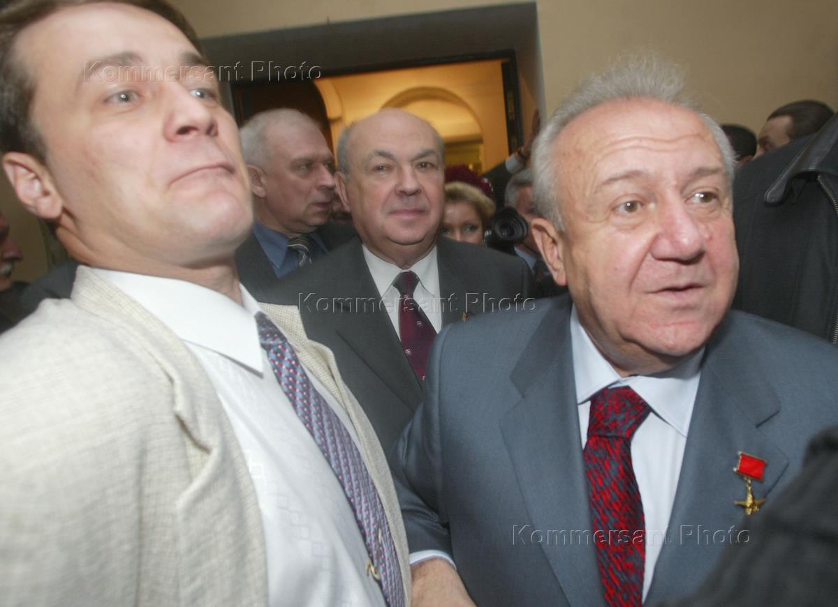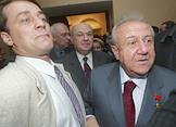 Президент Академии художеств России Зураб Церетели (справа) и первый вице-премьер правительства Москвы по архитектуре, строительству, развитию и реконструкции Владимир Ресин (в центре) на открытии выставки З.Церетели "Жизнь в искусстве". Открытие выставки состоялось в здании Академии художеств.