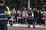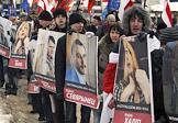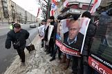 Участники акции оппозиции День Воли, посвященная 95-летию образования в 1918 года Белорусской Народной Республики. Портреты белорусских политзаключенных в руках участников.