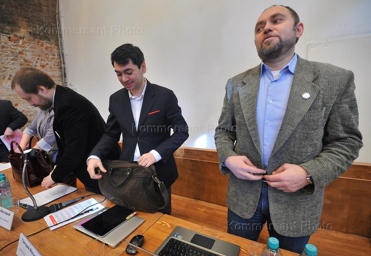 Cлева направо: член Совета общественного движения "СОНАР" Дмитрий Нестеров, заместитель директора ассоциации " Голос" Григорий Мельконьянц, координатор проектов по наблюдению за выборами ассоциации "Голос" Роман Удот во время пресс-конференции посвященной первому этапу кампании "Честный УИК", формированию участковых избирательных комиссий. Пресс-конференция прошла в музее и общественном центре имени А.Д. Сахарова.