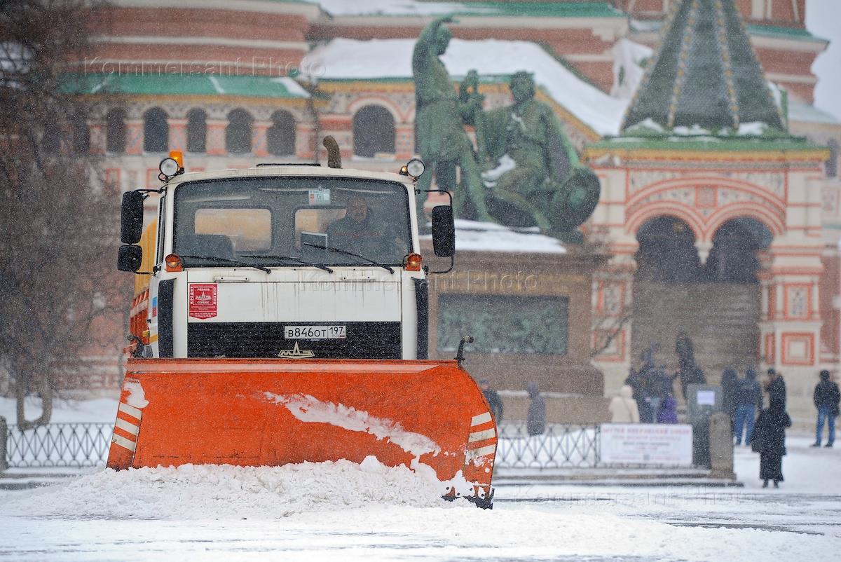 Снегопад в Москве. Уборочная техника коммунальной службы города во время уборки снега на Красной площади.