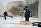 Снегопад в Москве. Сотрудник коммунальной службы города во время уборки снега.