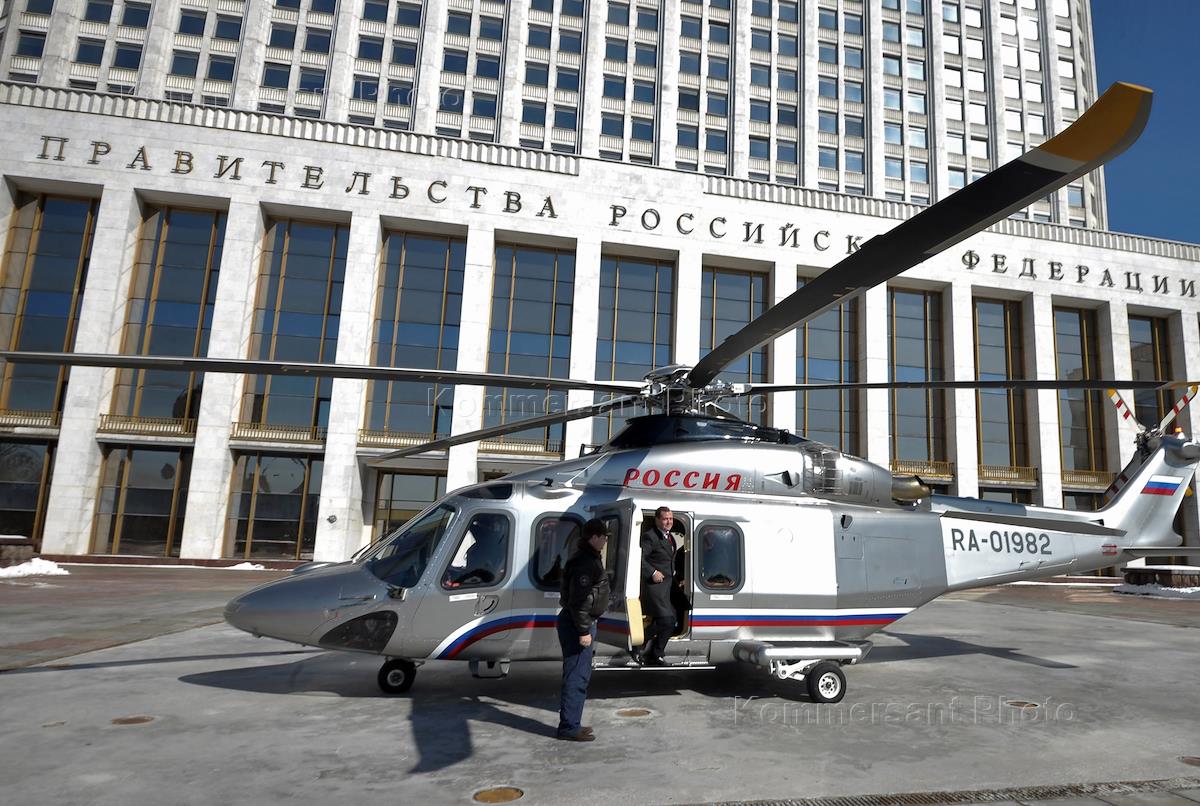 Вертолет председателя правительства России Дмитрия Медведева приземляется на вертолетную площадку перед Домом правительства России.