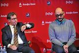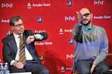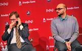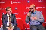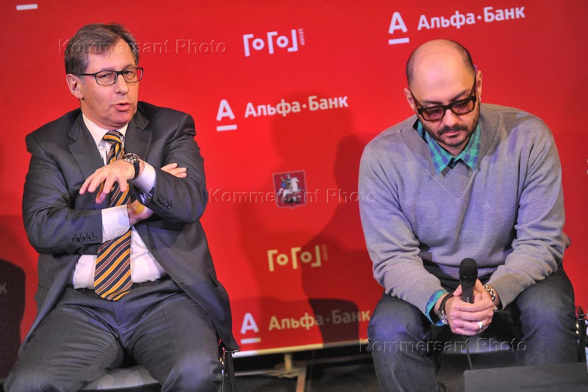 Президент "Альфа-банка" Петр Авен (слева) и художественный руководитель Гоголь-центра, режиссер Кирилл Серебренников (справа) во время пресс-конференции, посвященной запуску совместного проекта Гоголь-центра и "Альфа-Банка" при содействии департамента культуры правительства города Москвы.