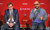 Художественный руководитель Гоголь-центра, режиссер Кирилл Серебренников (в центре) и президент "Альфа-банка" Петр Авен (справа) во время пресс-конференции, посвященной запуску совместного проекта Гоголь-центра и "Альфа-Банка" при содействии департамента культуры правительства города Москвы.