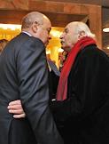 Специальный представитель президента России по международному культурному сотрудничеству Михаил Швыдкой (слева) и актер Владимир Зельдин (справа) на актерском капустнике, посвященном Дню театра. Капустник прошел в Доме актера.