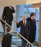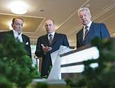 Слева направо: президент Клуба веселых и находчивых Александр Масляков, президент России Владимир Путин и мэр Москвы Сергей Собянин на церемонии открытия Московского молодежного центра "Планета КВН".
