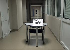 Жанровая фотография. Стол в коридоре офисного здания. Табличка с надписью "Хода нет".