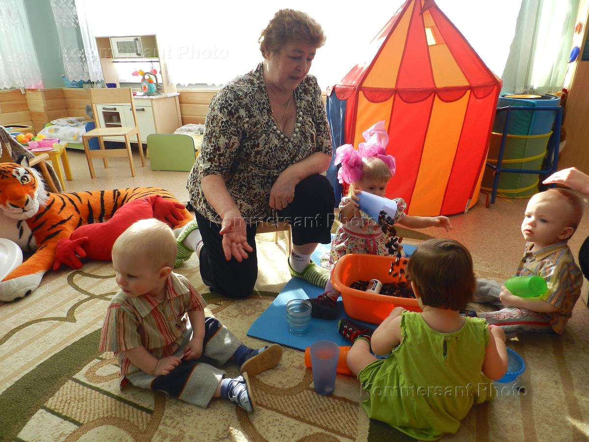 Новосибирский Дом ребенка № 2. Воспитательница с детьми в игровой комнате.