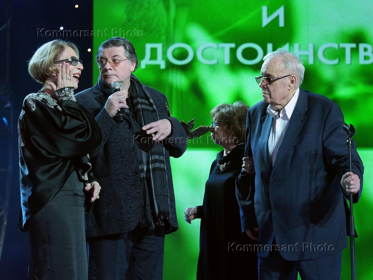 XXVI церемония вручения национальной кинематографической премии "Ника". Слева направо: актриса Инна Чурикова, художественный руководитель Театра Сатиры Александр Ширвиндт, актриса Лия Ахеждакова, режиссер Эльдат Рязанов и специальный представитель президента России по международному культурному сотрудничеству Михаил Швыдкой на церемонии в Московском государственном академическом театре Оперетты.