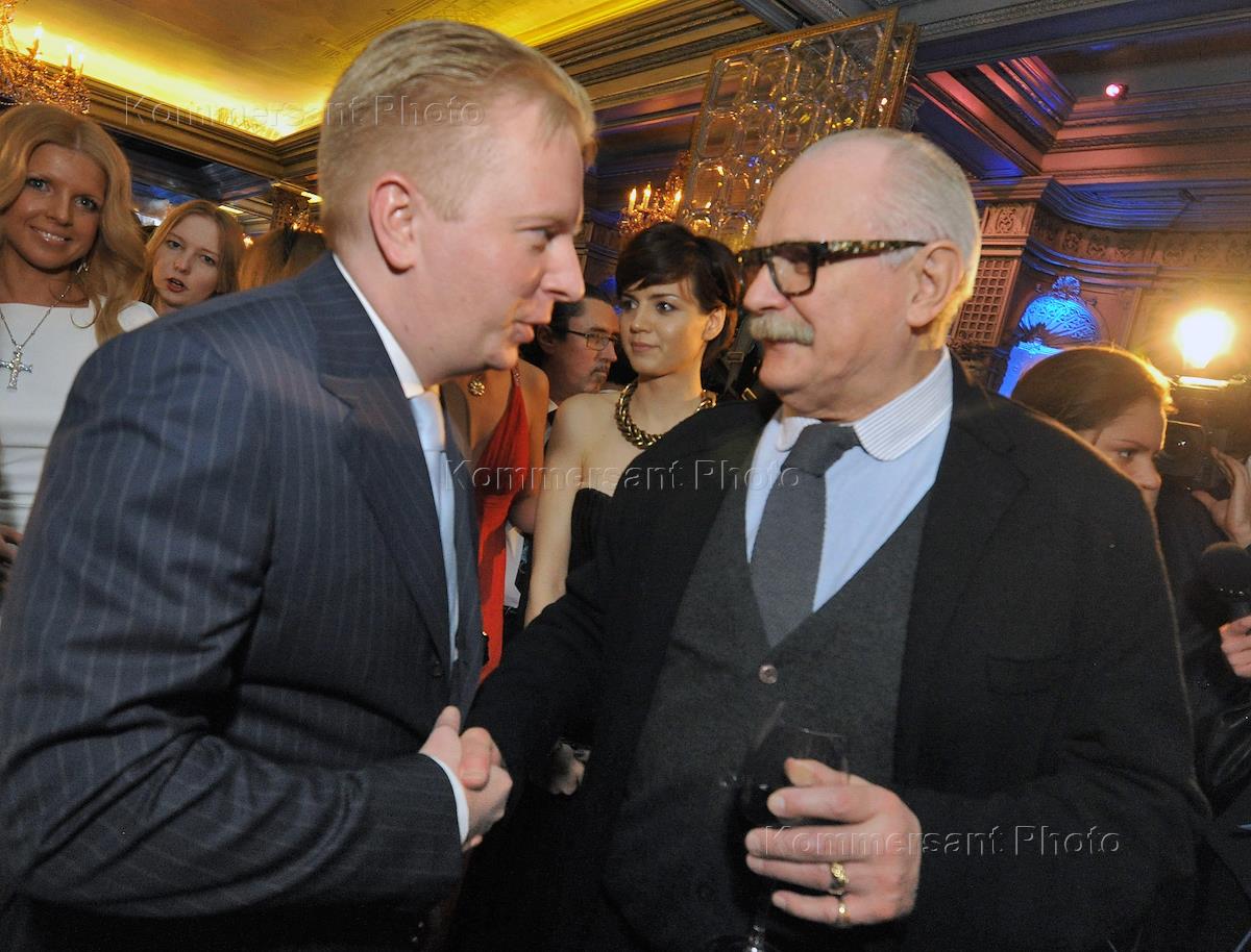 Вечеринка, в честь дня рождения российского издания журнала "The Hollywood Reporter". Председатель союза кинематографистов России, кинорежиссер Никита Михалков (слева) и председатель совета директоров - генеральный директор Российского Авторского Общества Федотов Сергей (справа) на вечеринке в ресторане "Каста Дива".