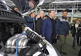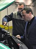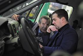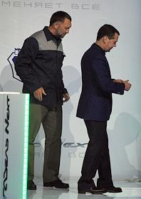 Председатель правительства России Дмитрий Медведев (справа) во время посещения Горьковского автомобильного завода (ГАЗ).