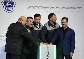 Председатель правительства России Дмитрий Медведев (справа) и председатель наблюдательного совета компании "Базовый элемент" Олег Дерипаска (в центре) на церемонии запуска производства автомобилей "Газель Next" в цехе сборки Горьковского автомобильного завода.