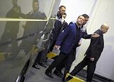 Председатель правительства России Дмитрий Медведев (слева), губернатор Нижегородской области Валерий Шанцев (второй слева) и председатель наблюдательного совета компании "Базовый элемент" Олег Дерипаска (справа) во время посещения Горьковского автомобильного завода (ГАЗ).