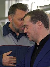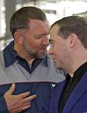 Председатель правительства России Дмитрий Медведев (справа) и председатель наблюдательного совета компании "Базовый элемент" Олег Дерипаска (слева) во время посещения Горьковского автомобильного завода (ГАЗ).