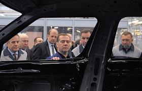 Председатель правительства России Дмитрий Медведев (в центре) во время посещения Горьковского автомобильного завода (ГАЗ).