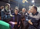 Председатель правительства России Дмитрий Медведев (в центре) и губернатор Нижегородской области Валерий Шанцев (справа) во время посещения Горьковского автомобильного завода (ГАЗ).