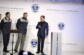 Церемония пуска производственной линии автомобилей "Газель Next" на Горьковском автомобильном заводе. Слева направо: губернатор Нижегородской области Валерий Шанцев, председатель совета директоров ОАО "ГАЗ", председатель совета директоров ОАО "Русские машины" Зигфрид Вольф, президент "Группы ГАЗ", член совета директоров ОАО "ГАЗ" Бу Инге Андерссон, председатель наблюдательного совета компании "Базовый элемент" Олег Дерипаска и председатель правительства РОссии Дмитрий Медведев во время церемонии.