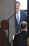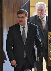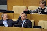 Руководитель Федерального агентства по делам Содружества Независимых Государств (СНГ), соотечественников, проживающих за рубежом, и по международному гуманитарному сотрудничеству Константин Косачев (слева) на заседании Государственной думы России.