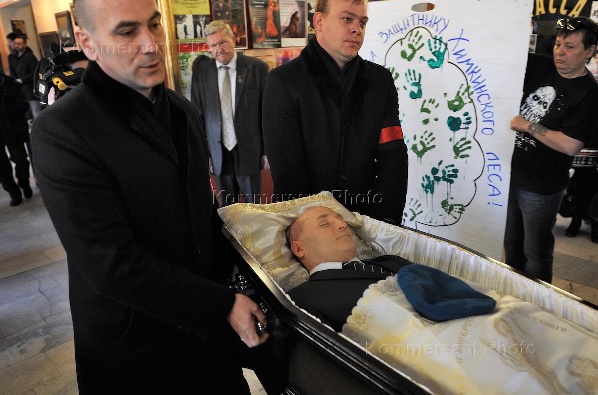 Председатель партии "Яблоко" Сергей Митрохин (слева) во время церемонии прощания с главным редактором "Химкинской правды" Михаилом Бекетовым, скончавшемся 8 апреля в клинической больнице №119 города Химки. Церемония прошла в Центральном доме журналиста.