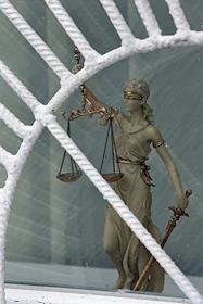 Жанровая фотография. Судебная система. Статуэтка богини правосудия - Фемиды - в окне здания суда.