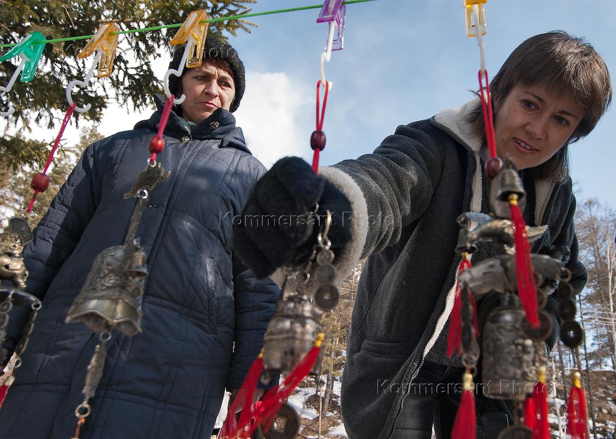 Продажа туристам сувениров-оберегов на берегу озера Байкал.