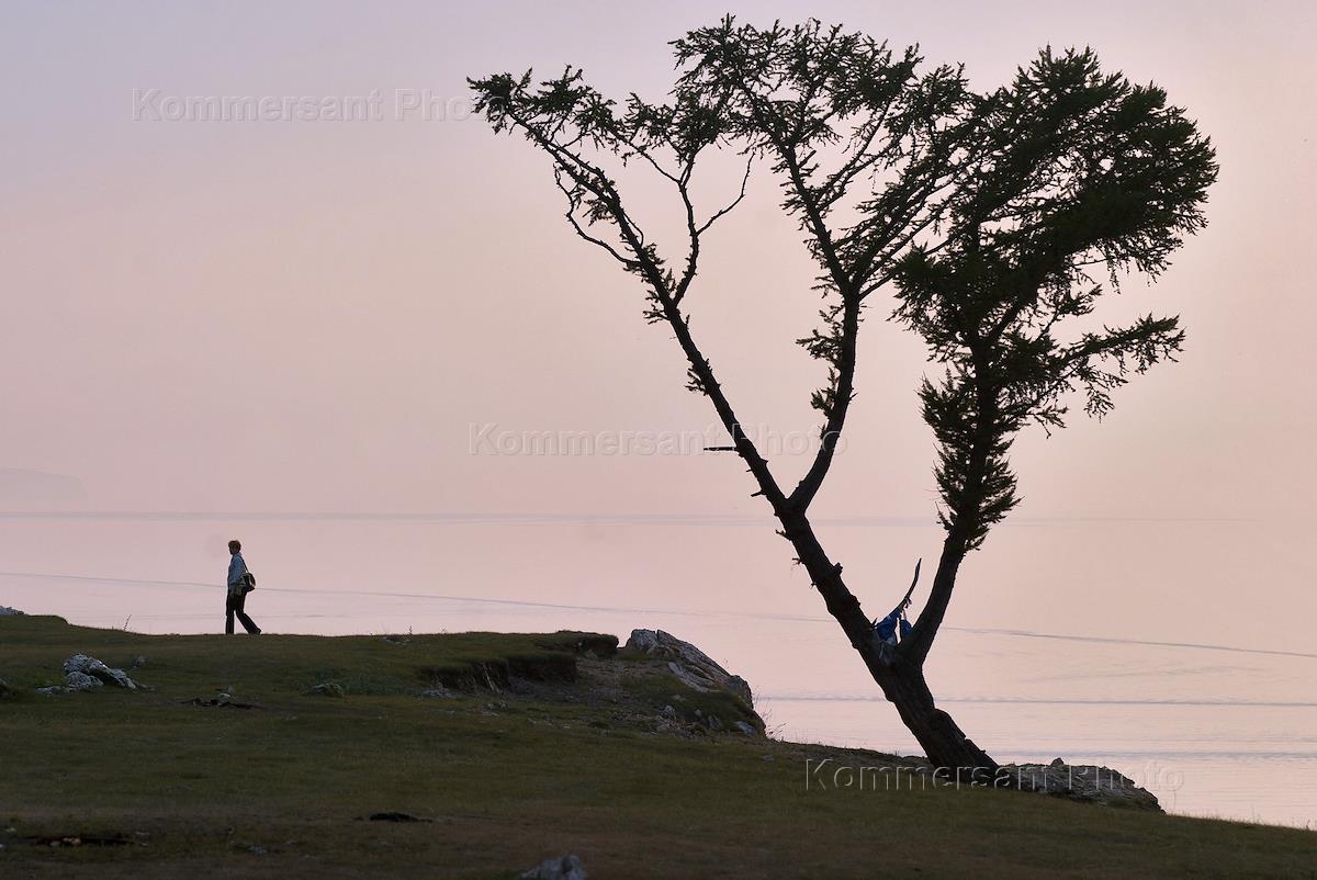 Виды озера Байкал. Дерево на берегу озера.