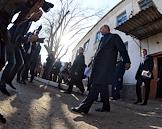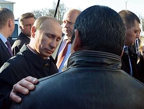 Визит президента России Владимира Путина в Элисту. Президент РФ Владимир Путин (в центре) во время осмотра ветхого жилья перед совещанием по вопросам переселения граждан из аварийного жилищного фонда.