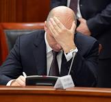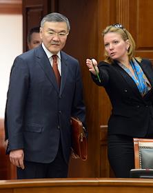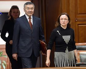 Визит президента России Владимира Путина в Элисту. Президент Республики Калмыкии Алексей Орлов (в цеентре) и помощник Президента России Эльвира Набиуллина (справа) перед началом совещания.