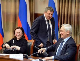 Совещание по вопросам переселения граждан из аварийного жилищного фонда. Слева направо: помощник Президента России Эльвира Набиуллина, министр регионального развития России Игорь Слюняев, министр экономического развития России Андрей Белоусов перед началом совещания.