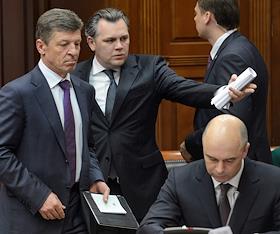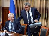 Визит президента России Владимира Путина в Элисту. Совещание по вопросам переселения граждан из аварийного жилищного фонда. Заместитель председателя правительства России Дмитрий Козак (слева) и министр финансов России Антон Силуанов (справа) перед началом совещания.