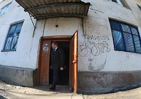 Визит президента России Владимира Путина в Элисту. Министр регионального развития России Игорь Слюняев во время осмотра ветхого жилья перед совещанием по вопросам переселения граждан из аварийного жилищного фонда.