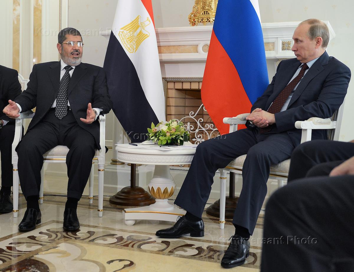 Президент Египта Мухаммед Мурси (слева) и президент России Владимир Путин (справа) во время встречи.