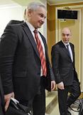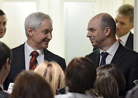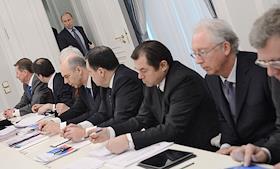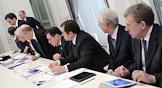 Совещание по экономическим вопросам. Слева направо: министр финансов России Антон Силуанов, председатель комитета Государственной думы России по бюджету и налогам Андрей Макаров, первый заместитель председателя правительства России Игорь Шувалов, советник президента России Сергей Глазьев во время совещания в резиденции "Бочаров ручей-2".