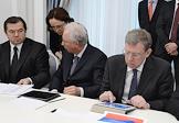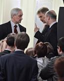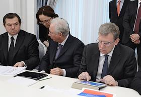 Совещание по экономическим вопросам. Слева направо: советник президента России Сергей Глазьев, председатель совета директоров МДМ-Банка Олег Вьюгин, председатель Комитета гражданских инициатив Алексей Кудрин в резиденции "Бочаров ручей-2".