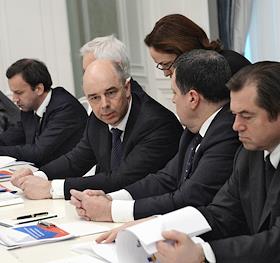 Министр финансов России Антон Силуанов (слева) и председатель комитета Государственной думы России по бюджету и налогам Андрей Макаров (справа) на совещании по экономическим вопросам с президентом России Владимиром Путиным в резиденции "Бочаров ручей-2".
