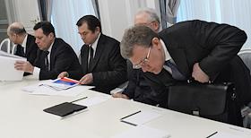 Совещание по экономическим вопросам. Слева направо: председатель правительства России Дмитрий Медведев, руководитель администрации Президента России Сергей Иванов, заместитель председателя Правительства России Аркадий Дворкович, министр финансов России Антон Силуанов, председатель комитета Государственной думы России по бюджету и налогам Андрей Макаров, советник президента России Сергей Глазьев, председатель совета директоров МДМ-Банка Олег Вьюгин, председатель Комитета гражданских инициатив Алексей Кудрин в резиденции "Бочаров ручей-2".