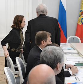 Помощник президента России Эльвира Набиуллина (слева) и председатель Центрального Банка России Сергей Игнатьев (в центре) во время совещания в резиденции "Бочаров ручей-2".