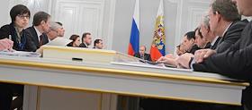 Президент России Владимир Путин (в центре) во время совещания по экономическим вопросам в государственной резиденции "Бочаров ручей-2".