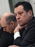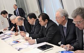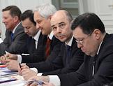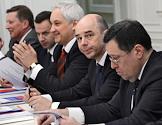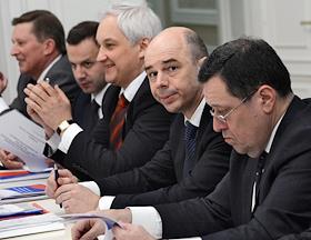 Совещание по экономическим вопросам. Слева направо: министр финансов России Антон Силуанов, председатель комитета Государственной думы России по бюджету и налогам Андрей Макаров, первый заместитель председателя правительства России Игорь Шувалов, советник президента России Сергей Глазьев во время совещания в резиденции "Бочаров ручей-2".