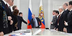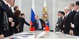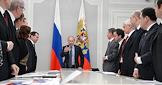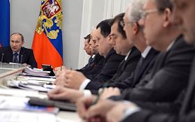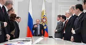 Президент России Владимир Путин (второй слева) перед началом совещания по экономическим вопросам. Слева направо: руководитель администрации Президента России Сергей Иванов, заместитель председателя Правительства России Аркадий Дворкович, министр финансов России Антон Силуанов, председатель комитета Государственной думы России по бюджету и налогам Андрей Макаров, советник президента России Сергей Глазьев, председатель совета директоров МДМ-Банка Олег Вьюгин, председатель Комитета гражданских инициатив Алексей Кудрин в резиденции "Бочаров ручей-2".
