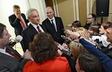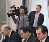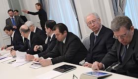 Советник президента России Сергей Глазьев (в центре)перед началом совещания по экономическим вопросам в резиденции "Бочаров ручей-2".