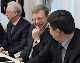Совещание по экономическим вопросам. Слева направо: председатель Комитета гражданских инициатив Алексей Кудрин, министр финансов России Антон Силуанов, председатель комитета Государственной думы России по бюджету и налогам Андрей Макаров во время совещания в резиденции "Бочаров ручей-2".