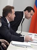 Совещание по экономическим вопросам. Первый заместитель председателя правительства России Игорь Шувалов (слева) и председатель правительства России Дмиртий Медведев (справа) во время совещания в резиденции "Бочаров ручей-2".