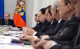 Совещание по экономическим вопросам. Слева направо: председатель правительства России Дмитрий Медведев, руководитель администрации Президента России Сергей Иванов, заместитель председателя Правительства России Аркадий Дворкович, министр финансов России Антон Силуанов, председатель комитета Государственной думы России по бюджету и налогам Андрей Макаров, советник президента России Сергей Глазьев, председатель совета директоров МДМ-Банка Олег Вьюгин, председатель Комитета гражданских инициатив Алексей Кудрин в резиденции "Бочаров ручей-2".
