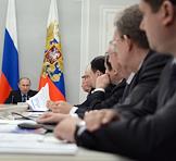Президент России Владимир Путин (в центре) во время проведения совещания по экономическим вопросам в резиденции "Бочаров ручей-2".