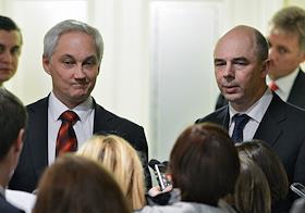 Министр финансов России Антон Силуанов (слева) и председатель комитета Государственной думы России по бюджету и налогам Андрей Макаров (справа) на совещании по экономическим вопросам с президентом России Владимиром Путиным в резиденции "Бочаров ручей-2".