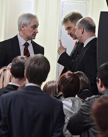 Совещание по экономическим вопросам. Министр экономического развития России Андрей Белоусов (слева), министр финансов России Антон Силуанов (второй справа), заместитель руководителя администрации президента России, пресс-секретарь Президента Дмитрий Песков (справа) в резиденции "Бочаров ручей-2".
