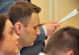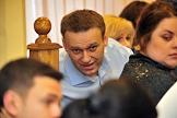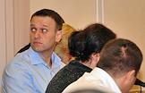 Председатель Координационного совета оппозиции (КСО) Алексей Навальный, обвиняемый в растрате имущества "Кировлеса", во время судебного слушания по его делу в Ленинском районном суде города Кирова.